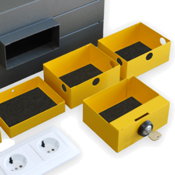 Dva klíče jsou dodávány s trezorem. Uvnitř je 5 zásuvek, které lze snadno vyjmout.