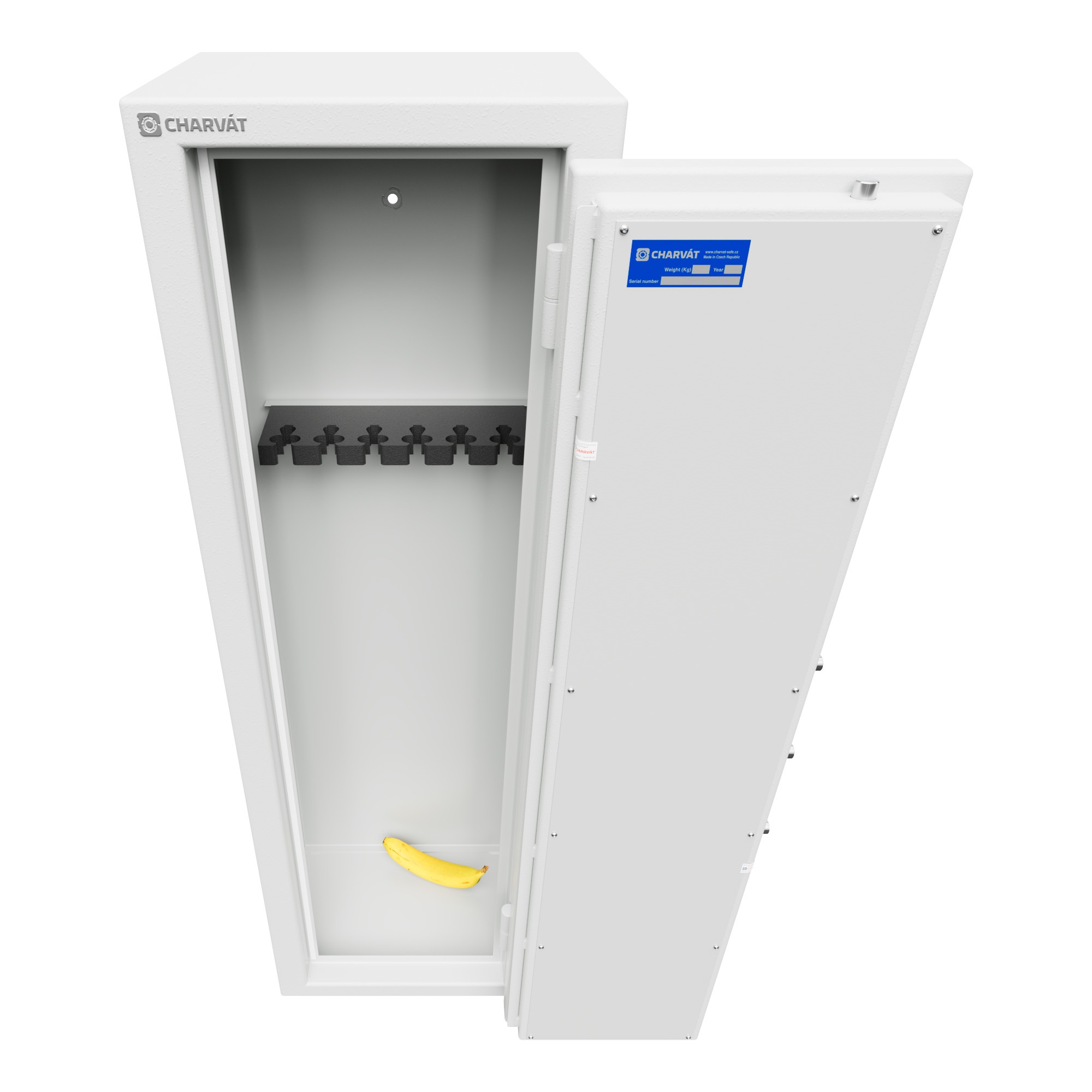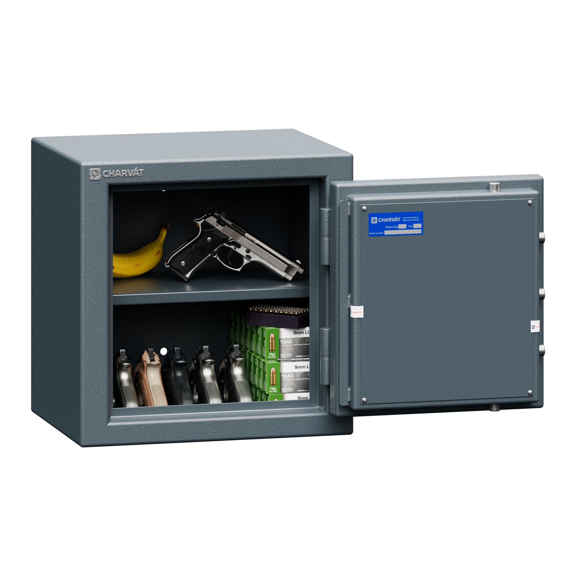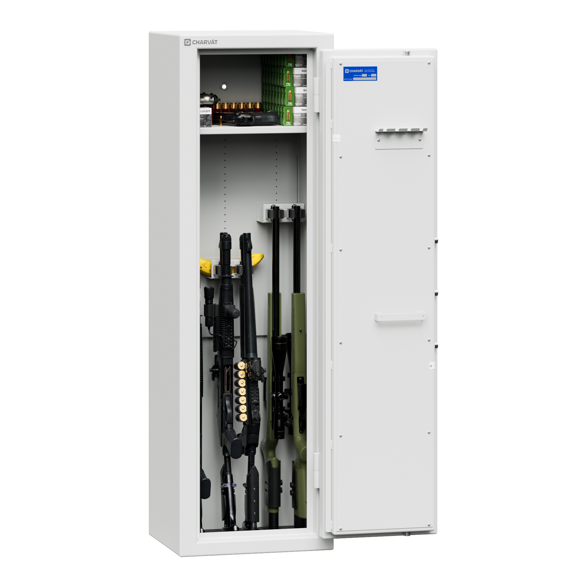 — Krátké zbraně lze pohodlně ukládat na police v pravé části trezoru.